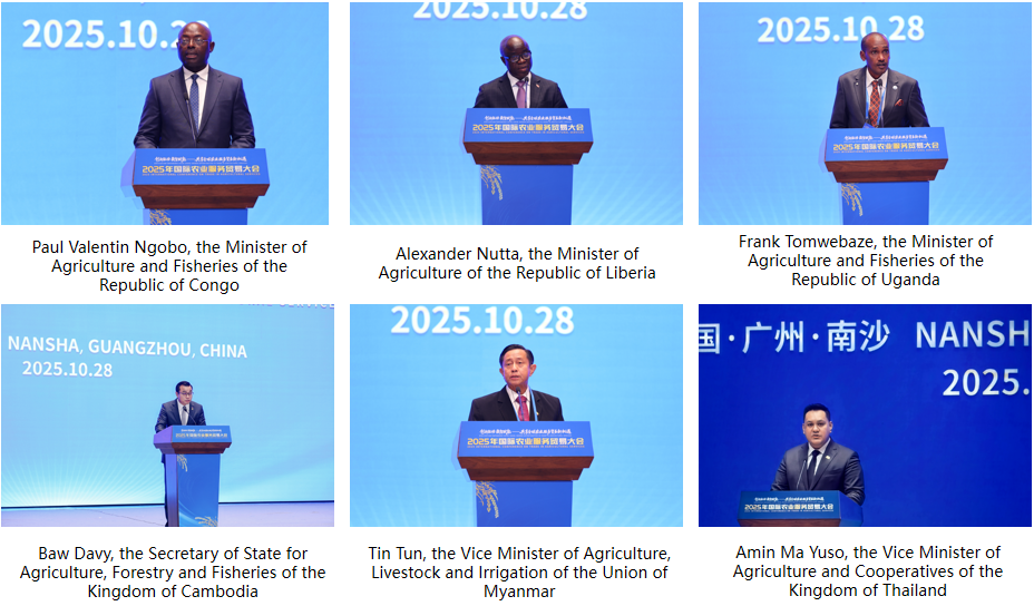 Zhang Zhili, the Party member of the Ministry of Agriculture and Rural Affairs, Vice Minister and Chen Liangxian, the Party member of Guangdong Provincial Government delivered speeches separately. Paul Valentin Ngobo, the Minister of Agriculture and Fisheries of the Republic of Congo, Alexander Nutta, the Minister of Agriculture of the Republic of Liberia, Frank Tomwebaze, the Minister of Agriculture and Fisheries of the Republic of Uganda, Baw Davy, the Secretary of State for Agriculture, Forestry and Fisheries of the Kingdom of Cambodia, Tin Tun, the Vice Minister of Agriculture, Livestock and Irrigation of the Union of Myanmar, Amin Ma Yuso, the Vice Minister of Agriculture and Cooperatives of the Kingdom of Thailand, Zhao Chunjiang, the Academician of the Chinese Academy of Engineering, Wang Bo, Deputy Director-General of the Department of Trade in Services and Commercial Services of the Ministry of Commerce, and Liu Wei, the Secretary of the Party Committee of Nansha District and Member of the Standing Committee of the CPC Guangzhou Municipal Committee, spoke at the forum.